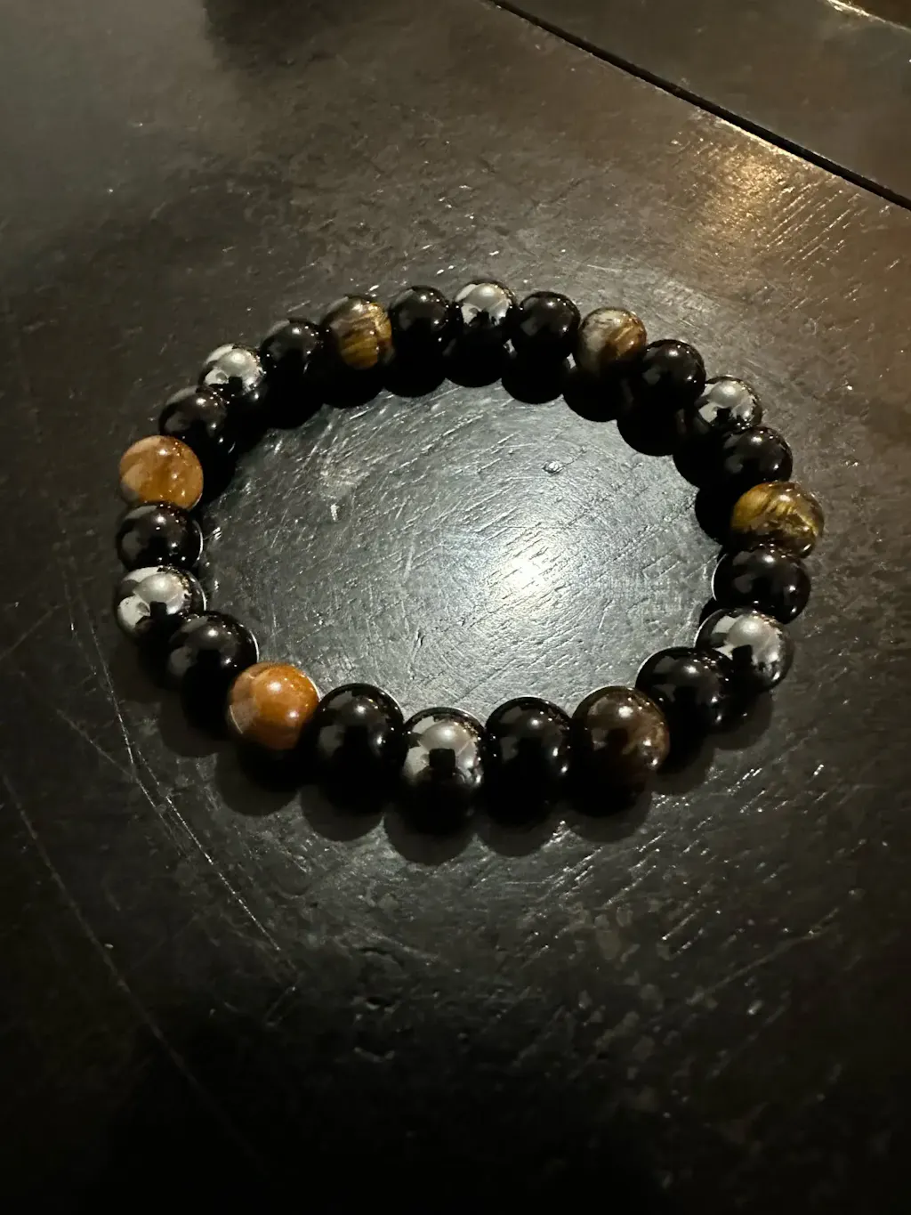 Natural black obsidian, hematite, and tiger eye beads with magnetic properties.